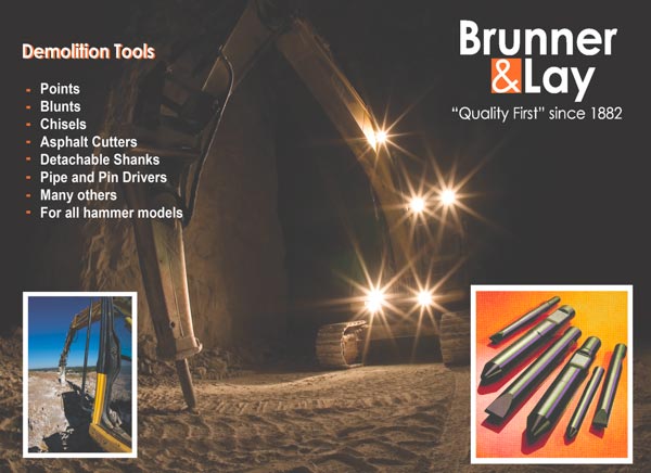 Brunner & Lay, Inc., manufactures one of the widest ranges of demolition tools in the U.S., for use with most types of heavy-duty, boom mounted breaker machines in use worldwide. Brunner & Lay tools are manufactured from high quality steel, which is then heat treated in ultra modern pit-type furnaces to create the hardness, impact strength and durability required to face the arduous conditions found in quarrying and mining. Our range of tools include points, chisels, blunts, and other specialized working ends, and are available through our distributors and agents around the world.